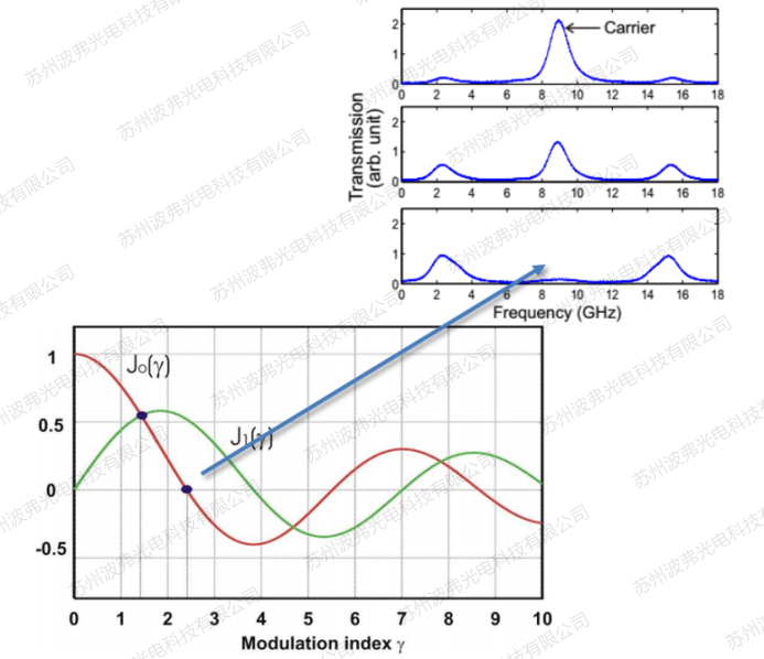 连续激光经过相位调制器后,通过光谱仪测量的结果是载波和多阶边带的频率,其频谱强度服从贝塞尔函数: