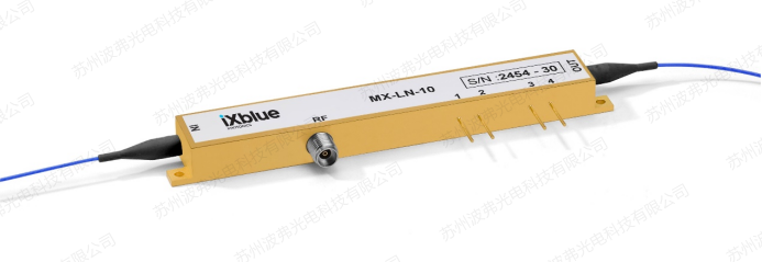 下图显示了M-Z电光调制器的典型外观结构,iXblue的强度调制器由一个射频RF端口和4个针脚组成: