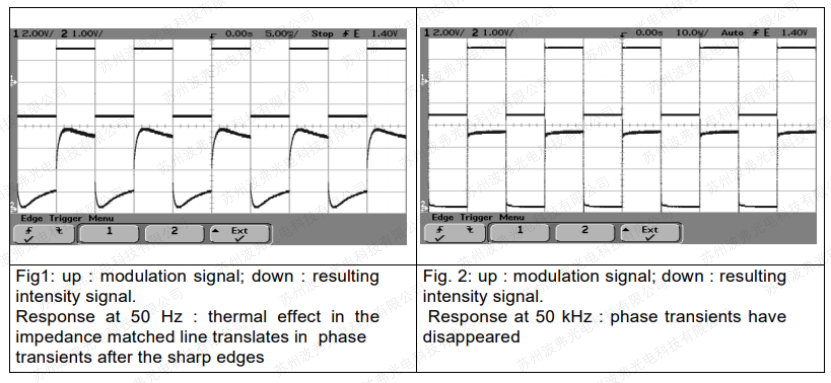 下面的图1和图2示出了当使用50Hz和50KHz方波调制信号时,使用高带宽相位调制器(MPZ-LN-20型,>20GHz电光带宽)。热效应的影响在图1中非常低频时清晰可见,在50kHz时热效应几乎消失