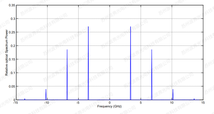 从上图可以看出,当调制深度为2.4的时候,载波消失,请参考微信文章“电光调制器半波电压随频率的变化”,CS-SSB情况下,下图为相位调制器输出光谱的模拟计算结果,载波在”0”所处位置消失,±1阶,±2阶和±3阶边带清晰可见,左右对称分布。