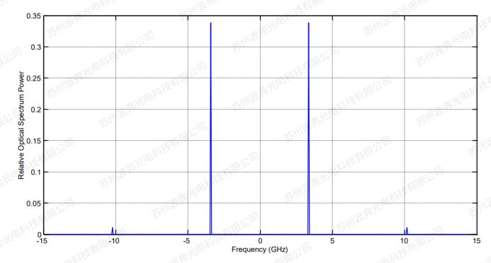 CS-SSB情况下,下图为强度调制器在Min点时的输出光谱的模拟计算结果,载波在”0”所处位置消失,±1阶边带清晰可见,±3阶边带少许出现。
