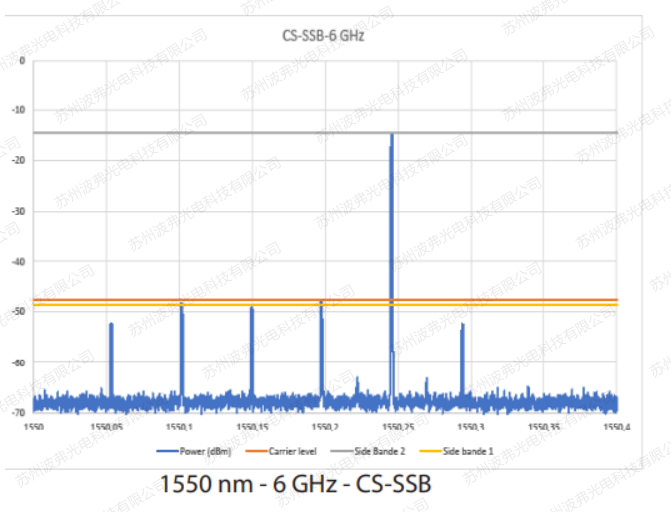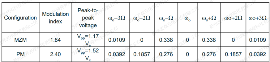 3. 强度调制器所产生的1阶边带强度高于相位调制器(见下表),因为相位调制器有部分强度分布在其他阶边带上