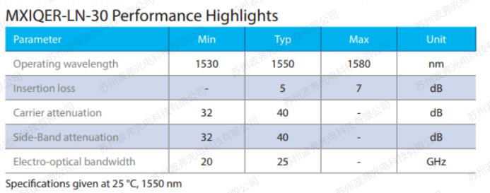 iXblue的MXIQER-LN-30是一款高带宽,低插损,高抑制比的双平行M-Z调制器,iXblue 专利技术“Magic Junction” (patent n° US2008193077)保证高达30dB以上的载波和边带抑制比。