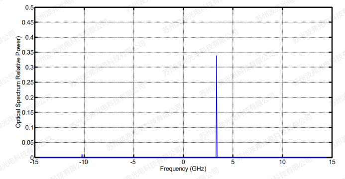 在CS-SSB情况下,下图为IQ调制器的输出光谱的模拟计算结果,载波在”0”所处位置消失,+1阶清晰可见,-3阶光谱少许出现。