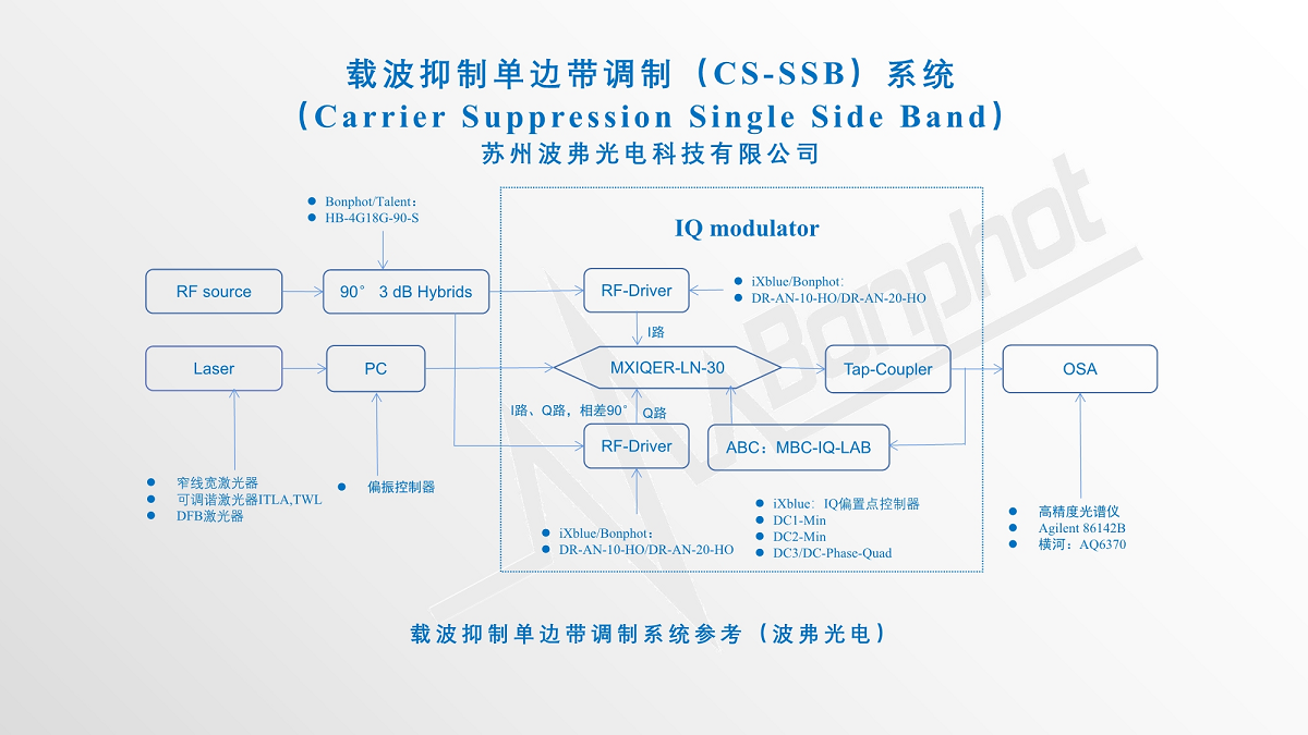 目前苏州bb平台体育艾弗森科技有限公司提供的基于法国iXblue公司的高消光比IQ调制器(MXIQER)、配合我们提供的驱动(DR-AN-10-HO/DR-AN-20-HO)以及偏置控制器(MBC-IQ-LAB-A1),可以实现>30dB(1000:1)载波抑制比,具有无可比拟的性能及优势。