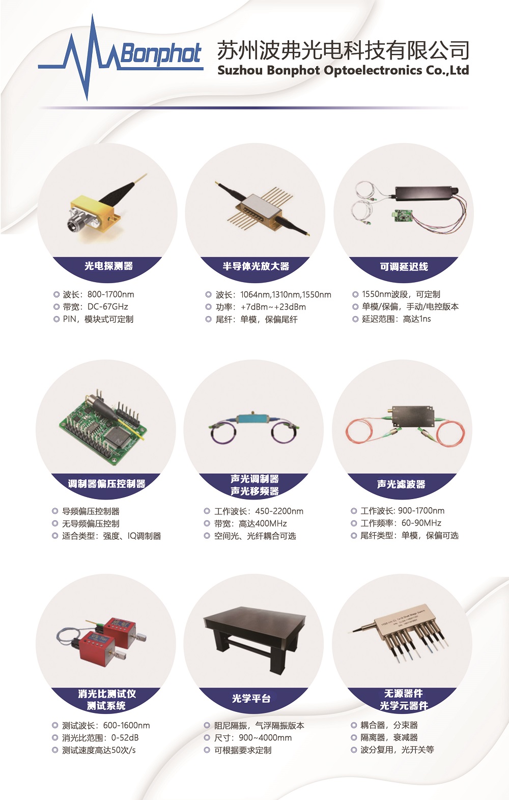 目前提供的主要产品:激光器,宽带光源,电光调制器(大量现货库存),声光调制产品,光放大器,光电探测器/接收器,高速光开关/开关矩阵,光纤滤波器,光学延迟线,偏振相关器件,自相关仪,光谱分析仪,太赫兹相关器件,高速电子产品,数据采集卡,激光二极管,激光器驱动,光纤及光纤熔接处理,光纤干涉仪,气室/气池,光学相干断层扫描系统,相机,OCT光谱仪,扫描振镜,MEMS振镜,光机械器件,光学平台。