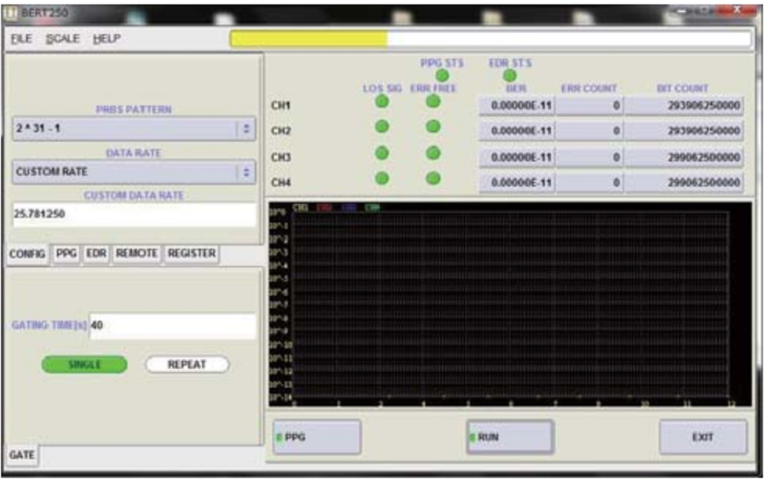 PPG-250C-x-4CH内置超稳定、低抖动时钟,EDR-250C-4CH带有正恢复时钟 (CDR) 使其非常适合光纤链路测试。这些单元可通过USB,GPIB端口程控,可以实现自动测试。