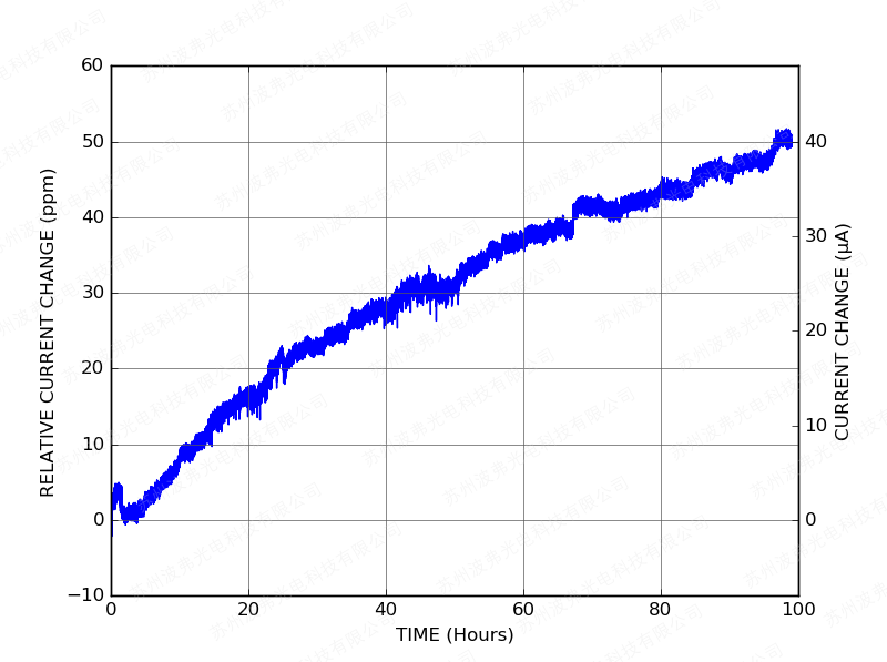 下图显示了CTL101激光控制器设置为800 mA电流(CTL101-2-B-800)在其前100小时运行期间的相对电流变化: