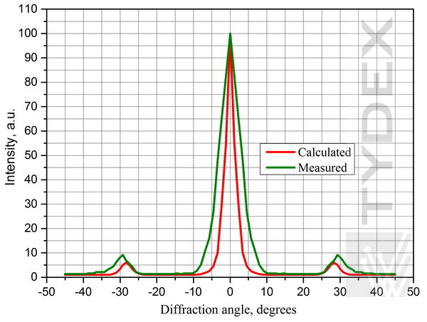 对于具有使用瑞利准则确定的特定透射带的衍射光栅,衍射单色波强度与波长有关。它在范围的中间达到最大值并在其边界附近下降。例如,图 3-6 显示,对于间距为 250 μm(透射带 1.56-3.12 THz,或 96-192 μm)的 TPX 和 ZEONEX 衍射光栅,λ=141 μm 单色波的一阶最大值强度是其数倍大于 λ=118 μm 单色波。 (第一个在传输带的中间,而第二个更靠近边缘。)它与使用 Fraunhofer 近似计算的单个单色波的理论衍射波强度和一阶极大角相匹配。由于测试光栅时使用不同的辐射源和光学布置,以下强度以任意单位给出。
